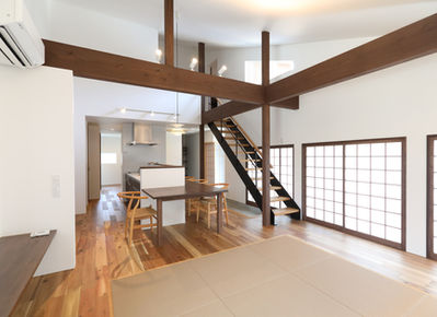 リビングは畳とフローリングの仕切りがなく広々とした大空間が広がる。柱や梁の存在感が和ごころを感じさせ、重厚感のある大人の雰囲気に。